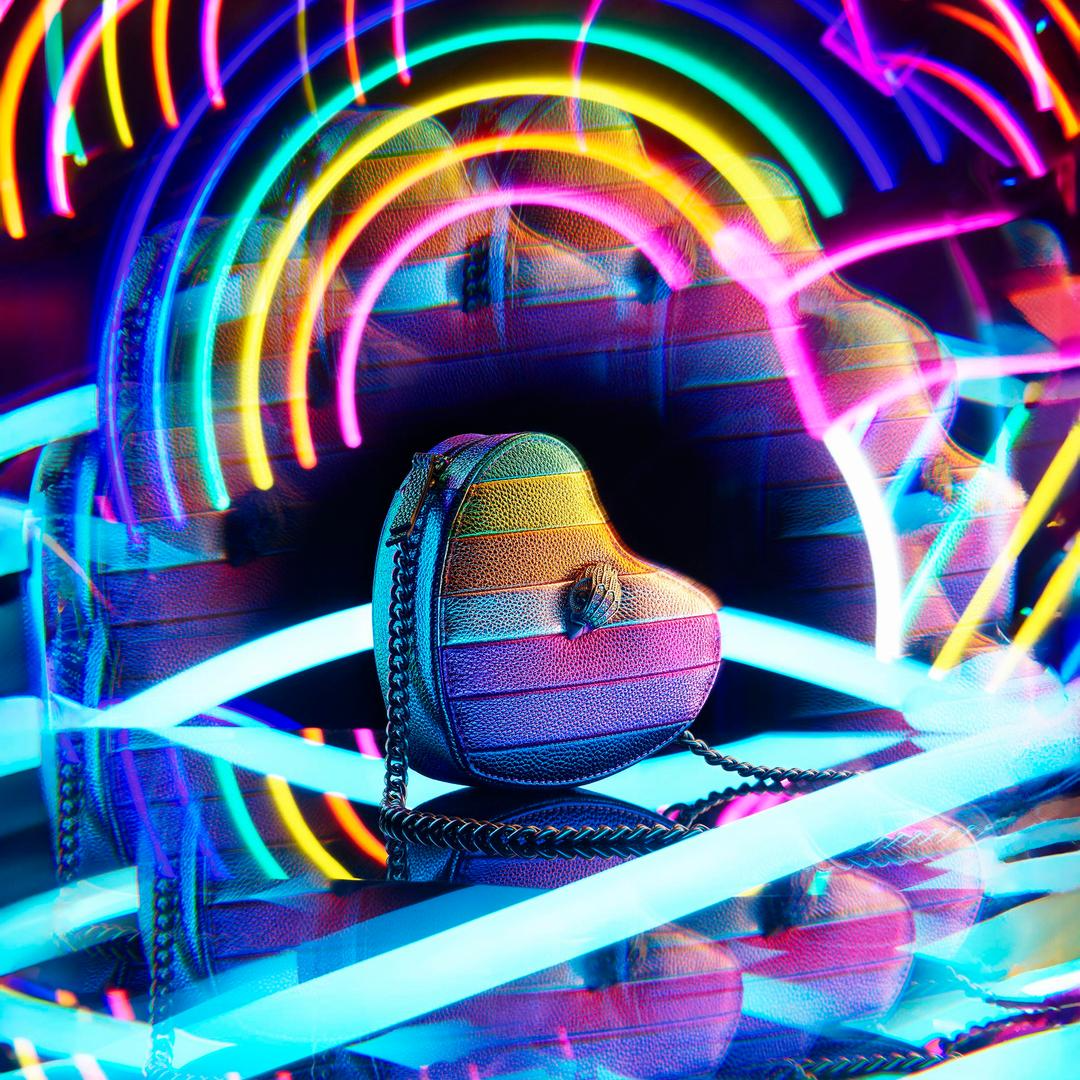 The Kensington Heart Bag is crafted from a metallic laminated pebble grain cow leather in the iconic diagonal rainbow sewn stripe pattern. The antiqued silver Eagle head features rainbow colored crystals and black bead eyes on the front.